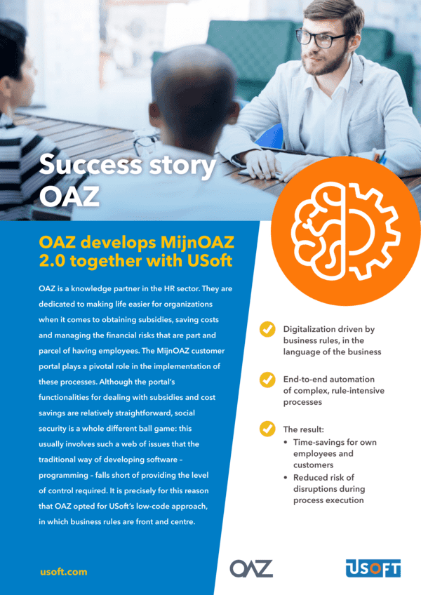 OAZ, kennispartner in de HR-sector, is toegewijd aan het vergemakkelijken van het leven voor organisaties bij het aanvragen van subsidies, het besparen van kosten en het beheren van de financiële risico's die inherent zijn aan het hebben van werknemers. Het nieuwe klantenportaal en de case management-oplossing op basis van het low-code platform van USoft vormen het podium voor volgende stappen in het toevoegen van meer diensten en het uitbreiden van de functionaliteit voor OAZ-klanten en haar HR-specialisten. OAZ heeft nu de flexibele oplossing die het nodig heeft om haar digitale transformatie voortdurend te optimaliseren.